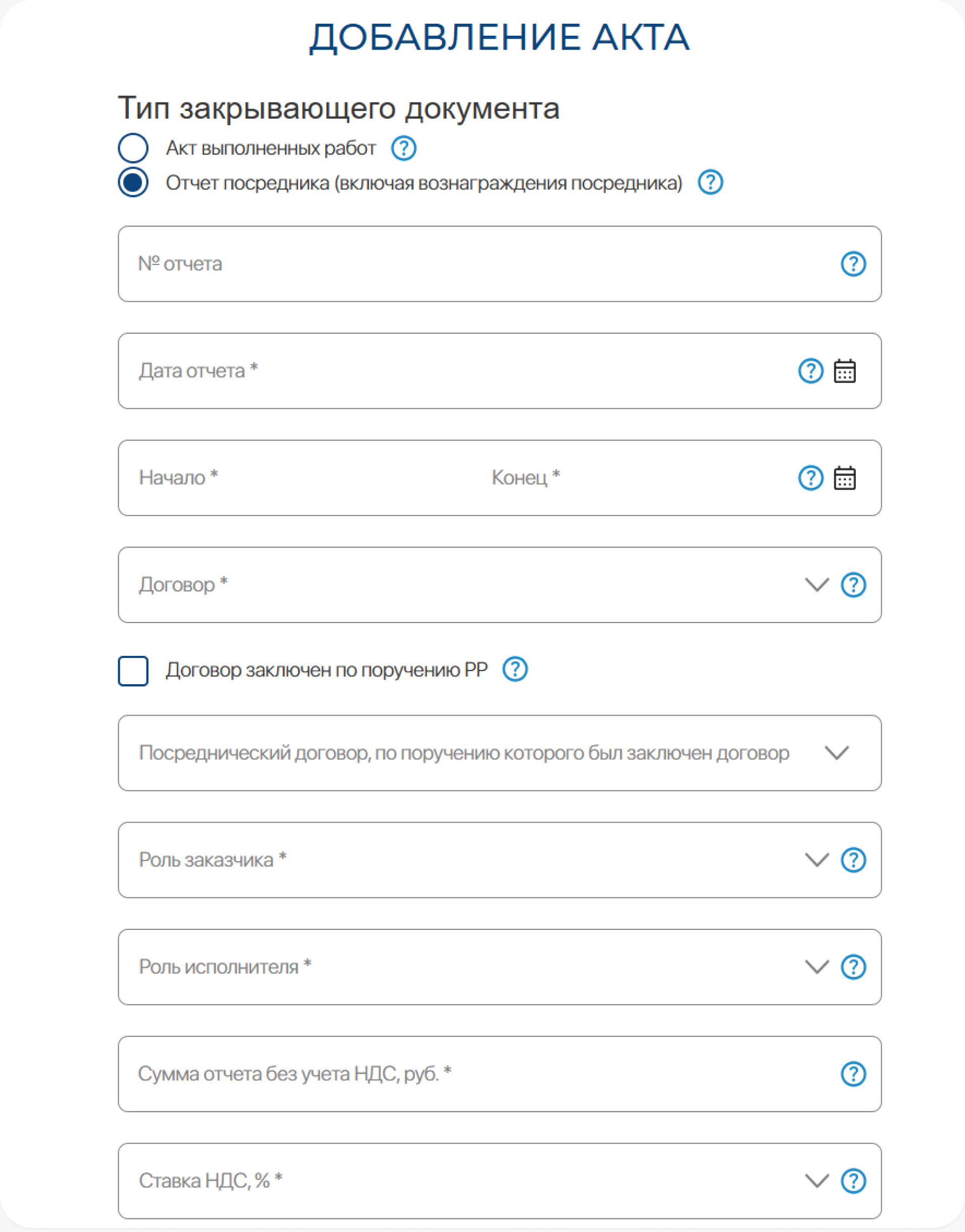 4) Договор, который закрывается этим отчетом (это может быть сам родительский договор, но допустимо указать и доп. соглашение/приложение). Начинаем вводить номер договора, ранее занесенного в систему, далее выбираем его из выпадающего списка. Тип такого договора должен обязательно быть – «Посреднический».