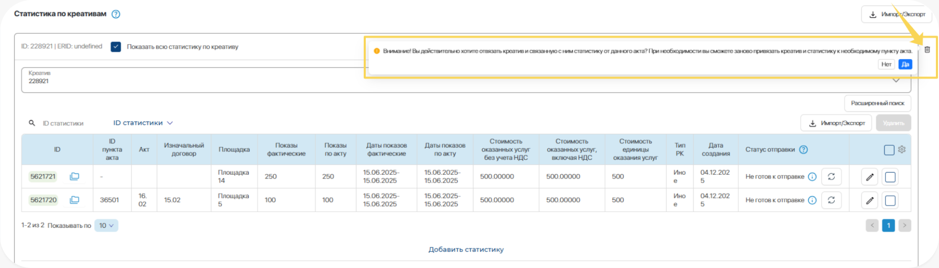 3. Если у акта есть пункт акта, в котором нет связи через креатив со статистикой, то при удалении появится уведомление, подтверждающее удаление акта и имеющихся пунктов акта.