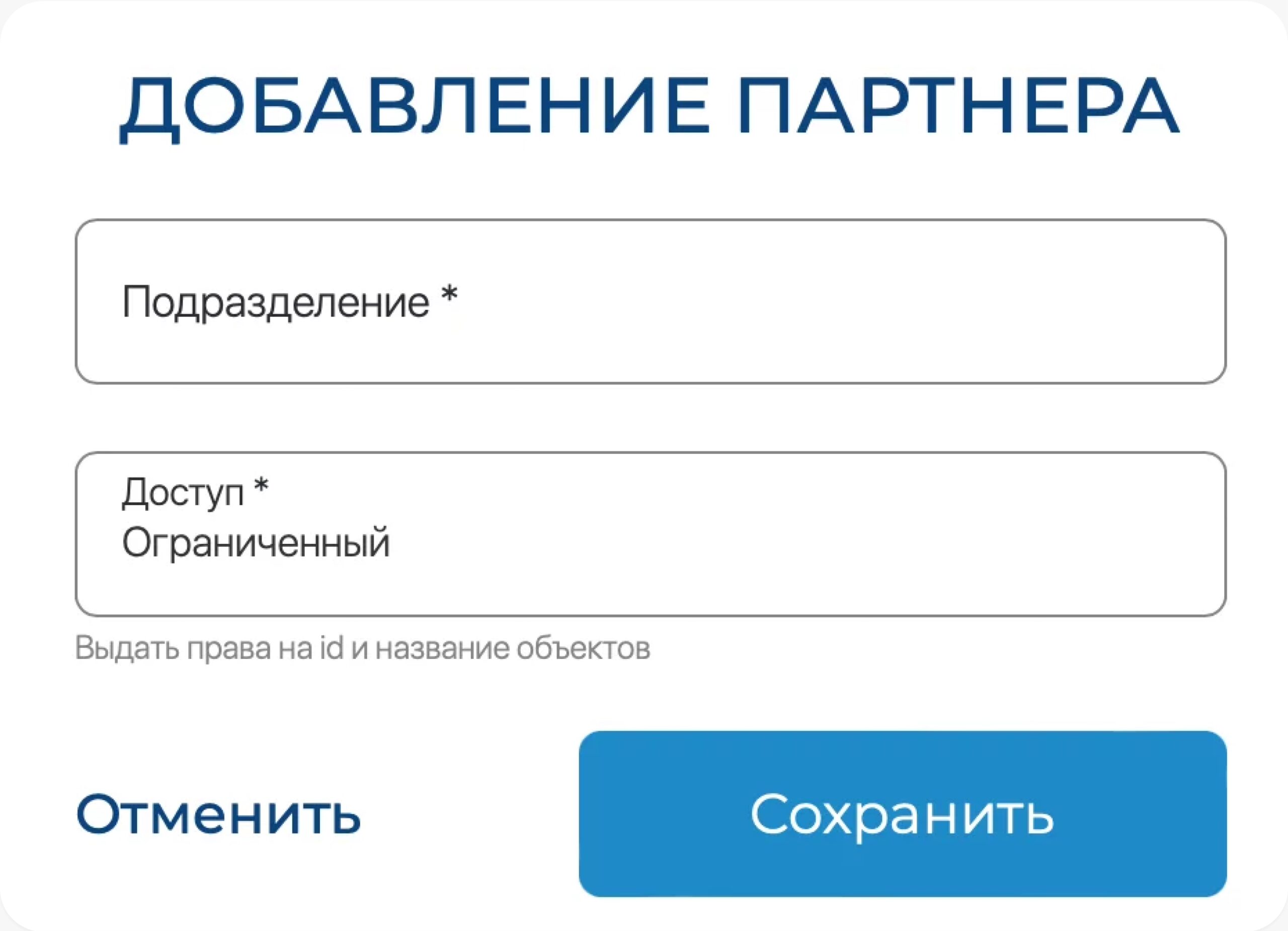 После выдачи доступа у Контрагента 2 появится возможность использовать партнерские id объектов, при этом объекты, созданные в ЛК1 – не появятся в ЛК2, но Контрагент 2 сможет на них сослаться (они появятся в выпадающих списках). Данные, которые Контрагент 2 создаст в своём ЛК, ссылаясь на партнёрские объекты, не появятся в ЛК Контрагента 1.