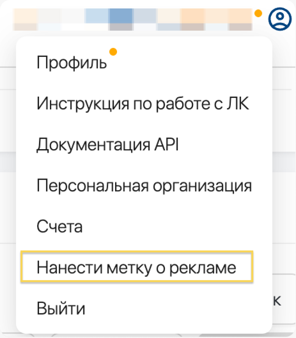 В выпадающем меню, которое находится под иконкой вашего профиля, расположен конструктор нанесения метки о рекламе. Данный функционал сделан для удобства пользователей.