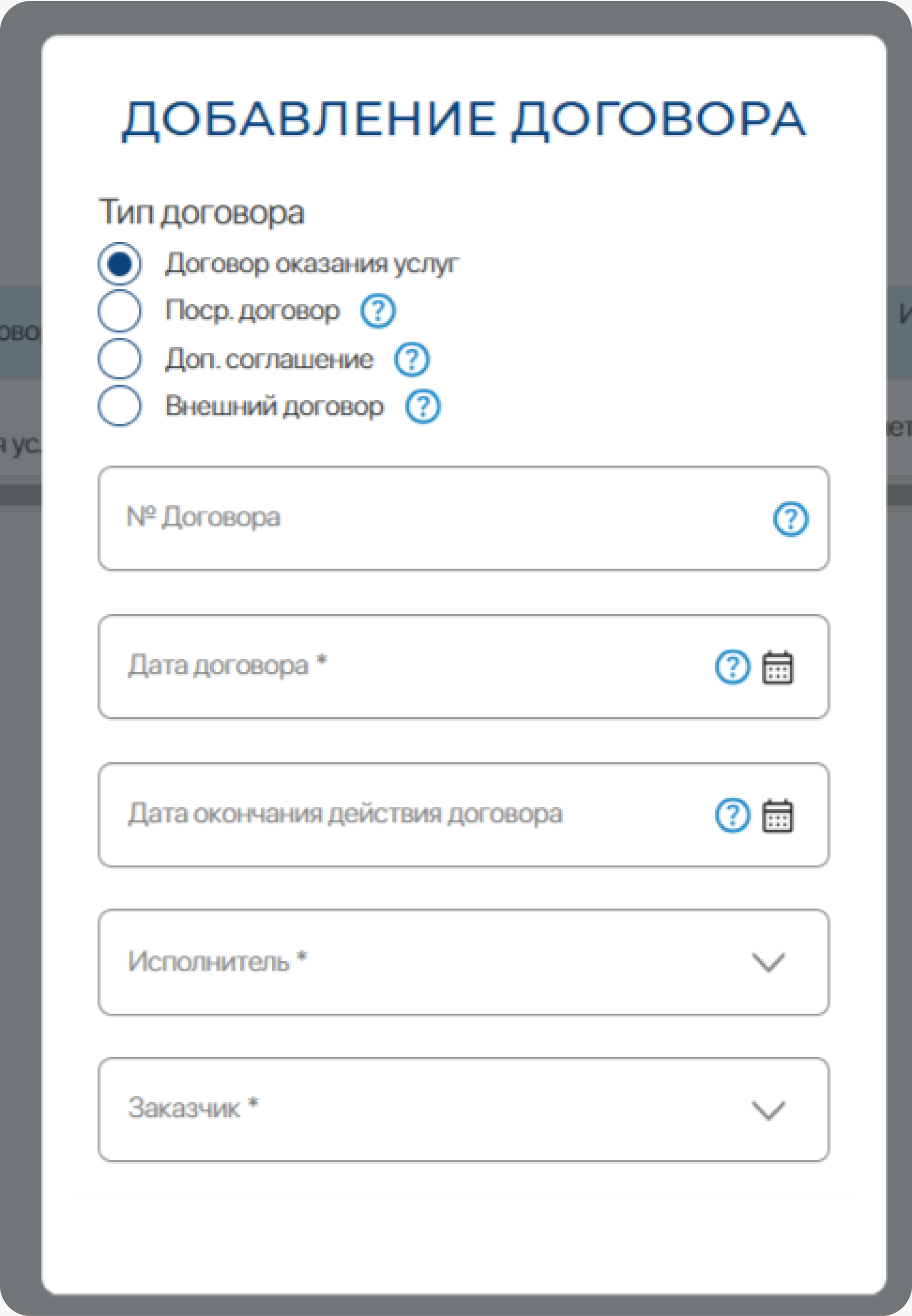* В случае выбора доп. соглашения указывается родительский договор. То есть вы сначала вносите данные по самому договору, затем привязываете к нему ДС как отдельный договор. Система свяжет их.