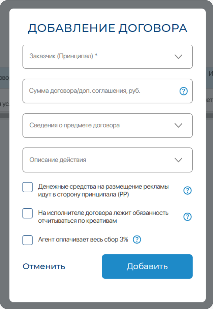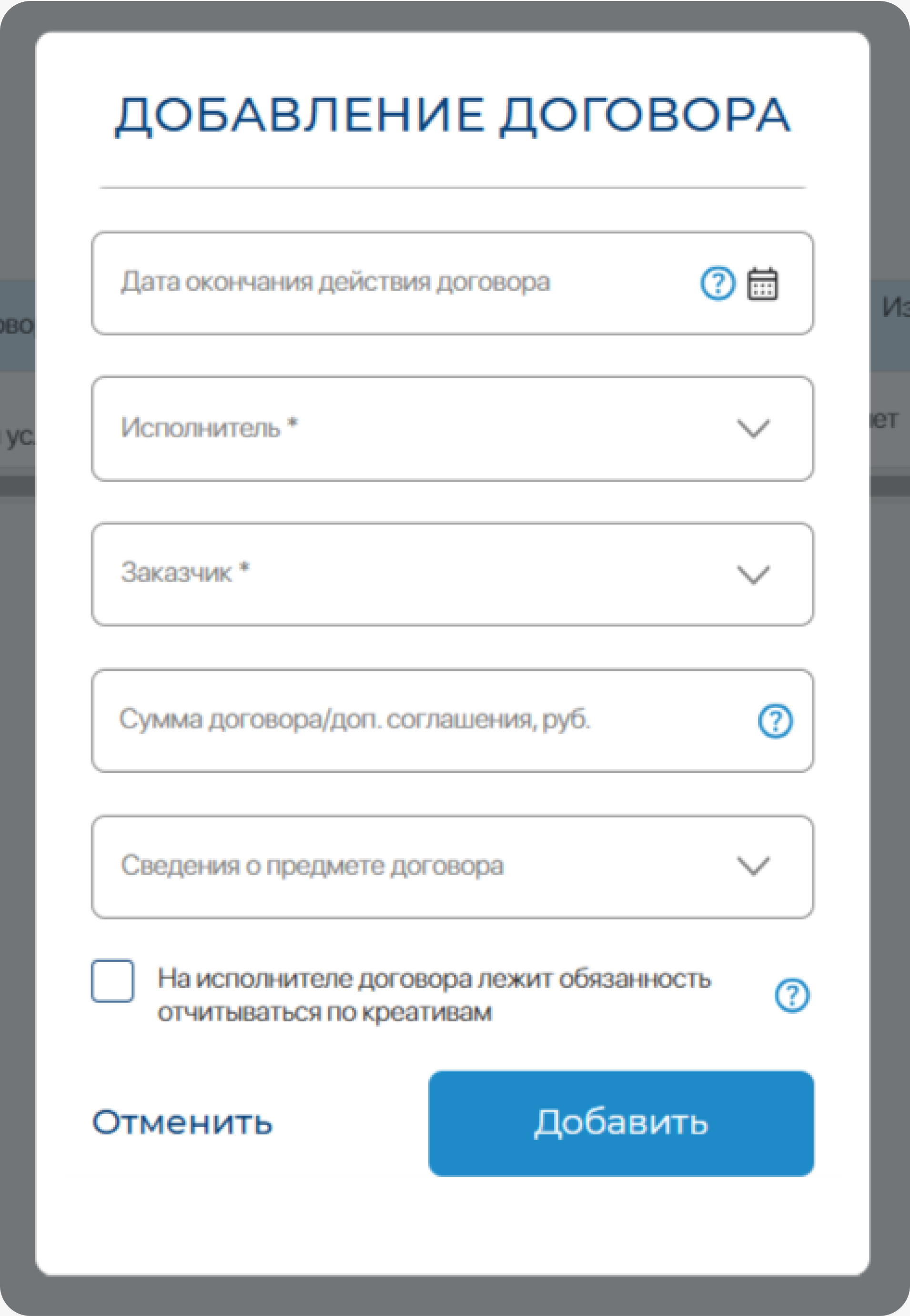 В разделе «Договоры» вы сможете вносить данные обо всех договорах: изначальном, исполнительском (доходном), а также договорах с контрагентами, за которых вам делегировали обязательство передавать данные в ОРД.