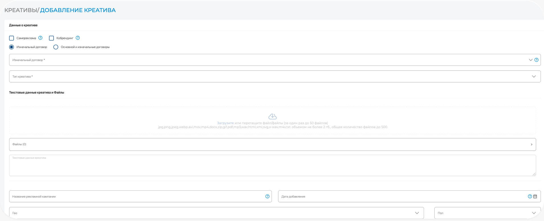В зависимости от типа креатива поля для загрузки медиа и/или текстовых данных будут активироваться.