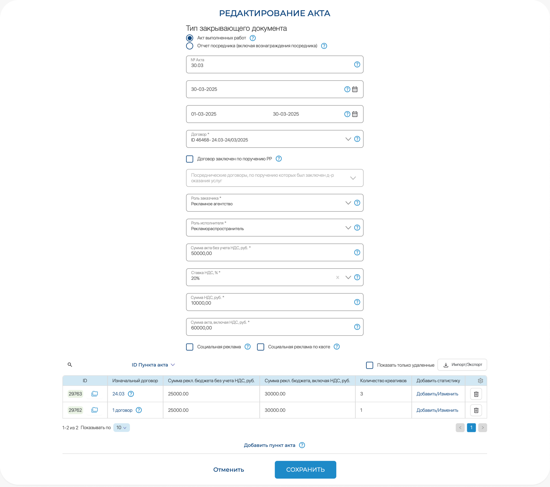 Статистика подается через раздел Креативы в случае, если акт был составлен на период более 1 месяца. Таблица со статистикой пополняется ежемесячно, где каждая новая строка – это данные по размещению конкретного креатива на определенной площадке за прошедший месяц.