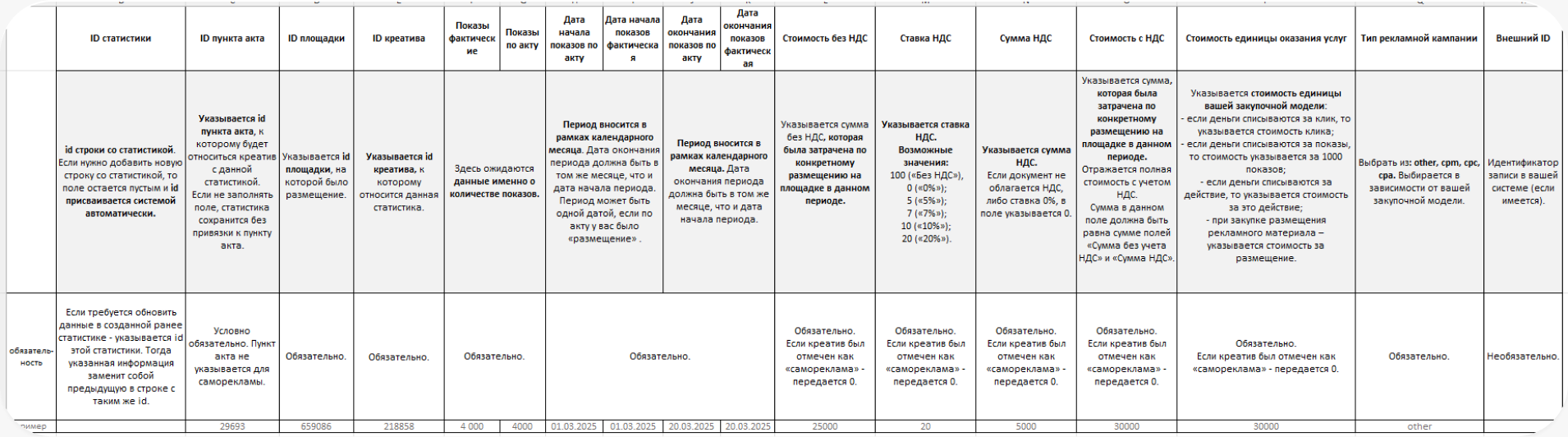 «Стоимость оказанных услуг без учета НДС» всех статистик, имеющих связь с одним пунктом акта, не должна превышать значение, указанное в поле «Сумма рекламного бюджет без учета НДС» в данном пункте акта. Допустима погрешность в 5%.