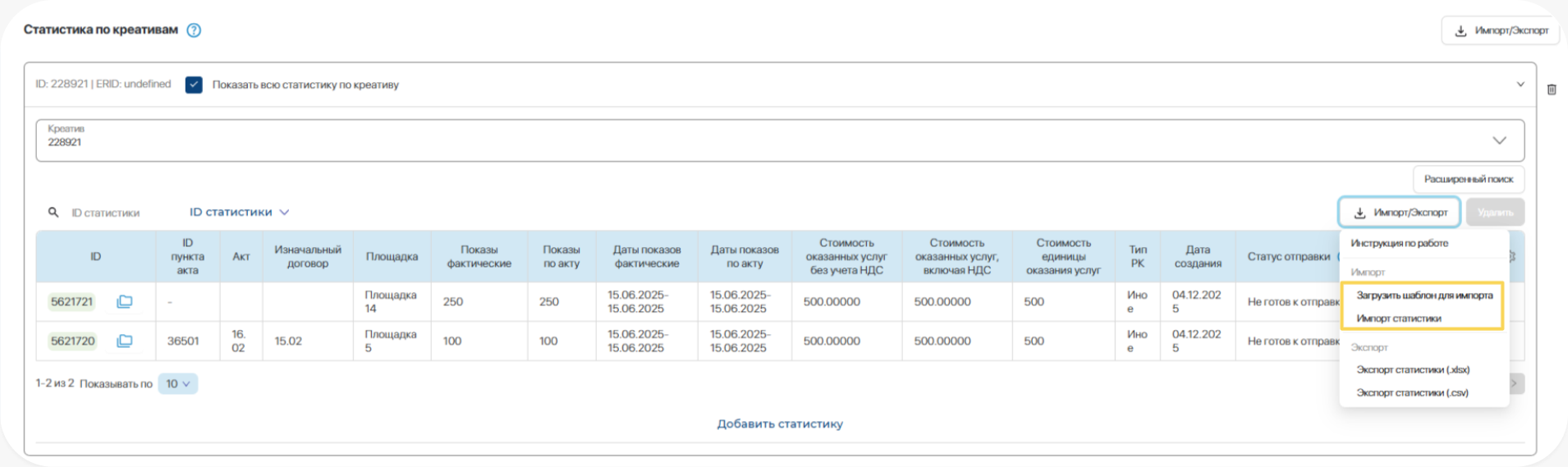 Экспорт/Импорт в разделе со статистикой по креативам (при разаллокации акта по креативам). В разделе разаллокации акта по креативам есть возможность массово: