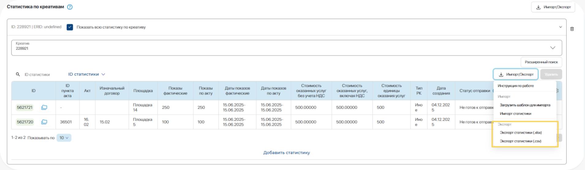2. экспортировать (выгрузить) все статистики по креативам, которые относятся к этому акту;