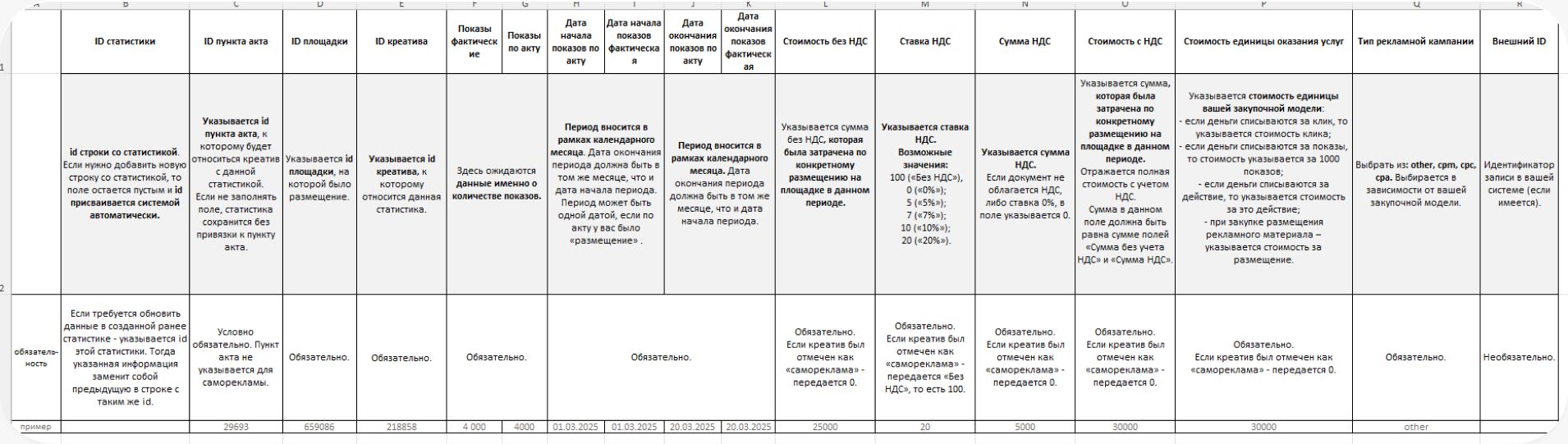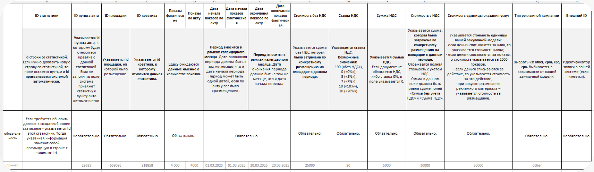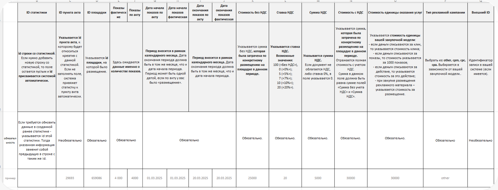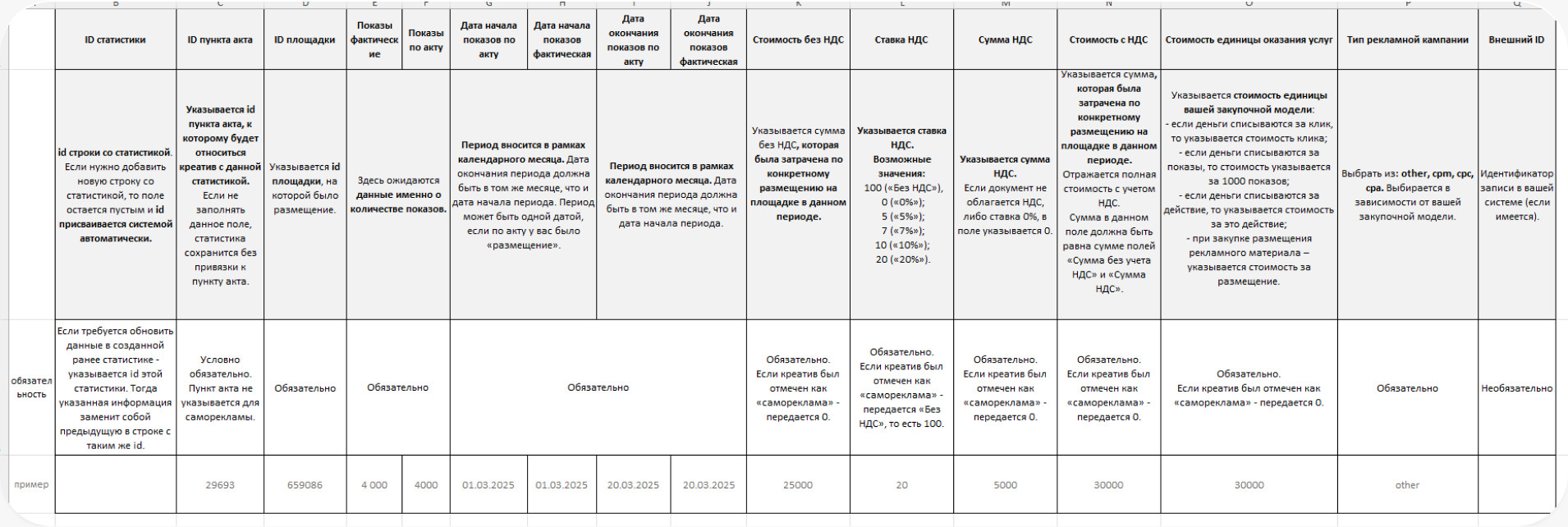 Для массовой загрузки в систему статистик, которые относятся к одному креативу, используется кнопка «Загрузить шаблон для импорта» – на ваше устройство скачается файл «statistics_import». Заполняем этот файл по шаблону: