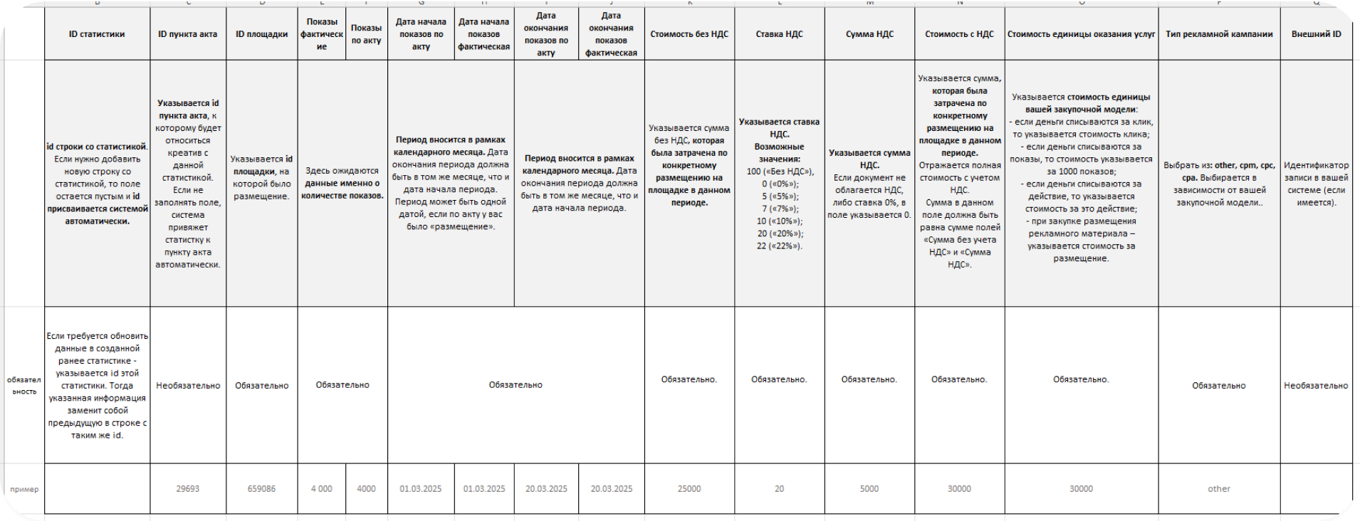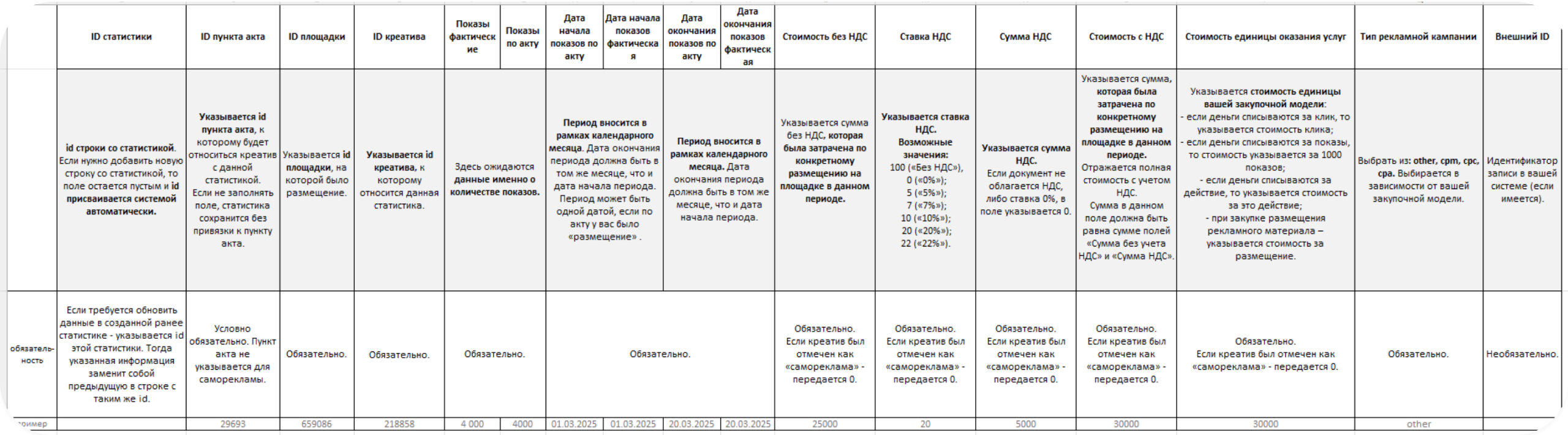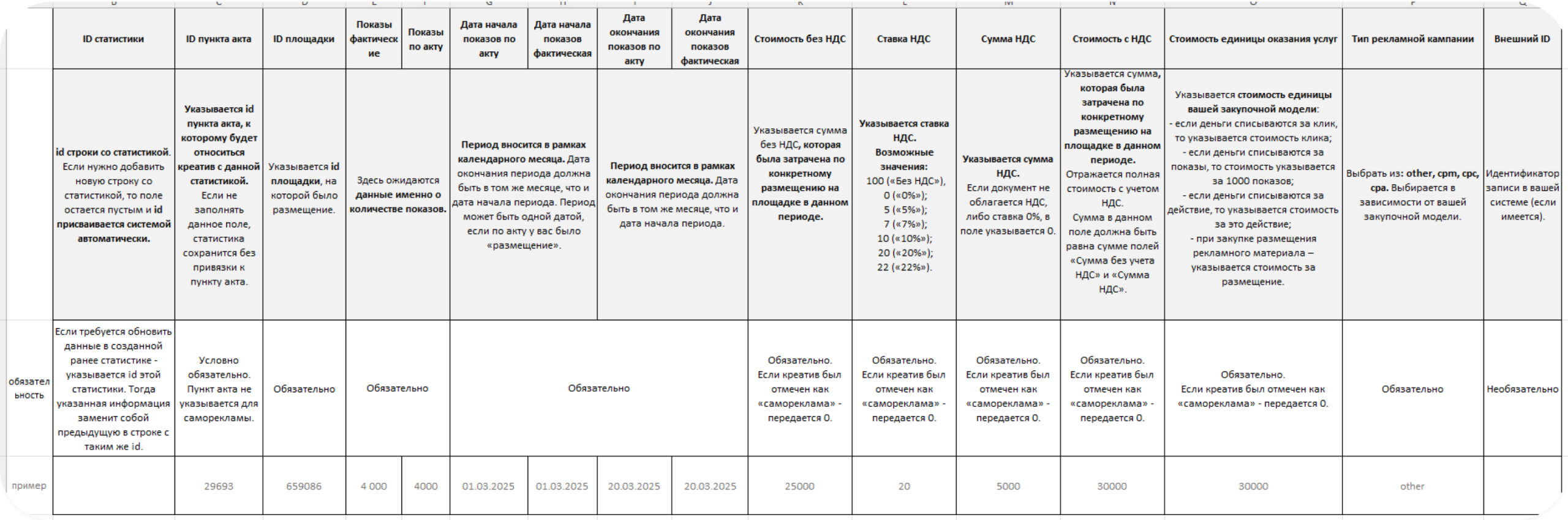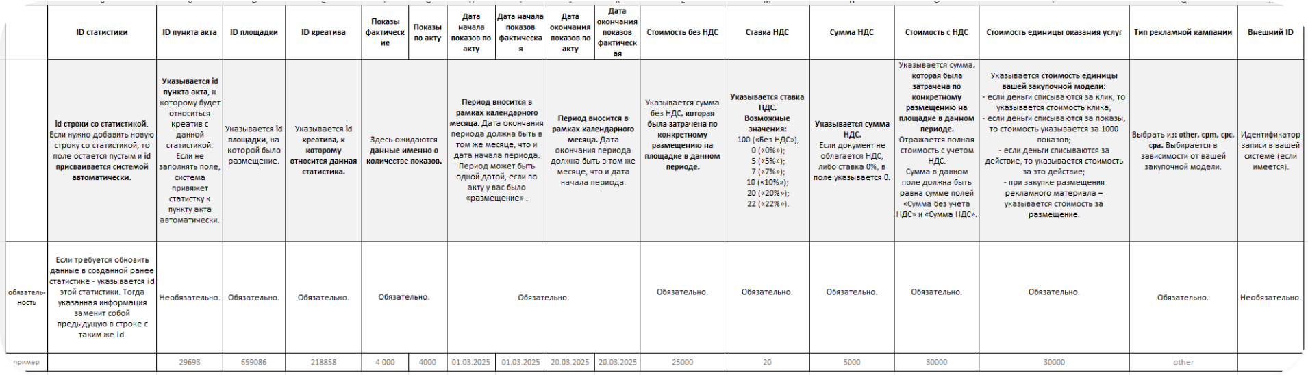 Для массовой загрузки в систему статистик, которые относятся к одному креативу, используется кнопка «Загрузить шаблон для импорта» – на ваше устройство скачается файл «statistics_import». Заполняем этот файл по шаблону: