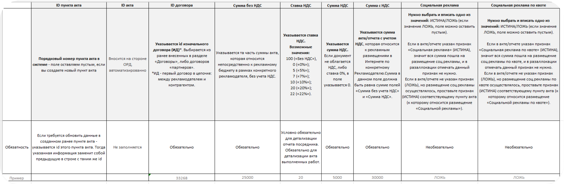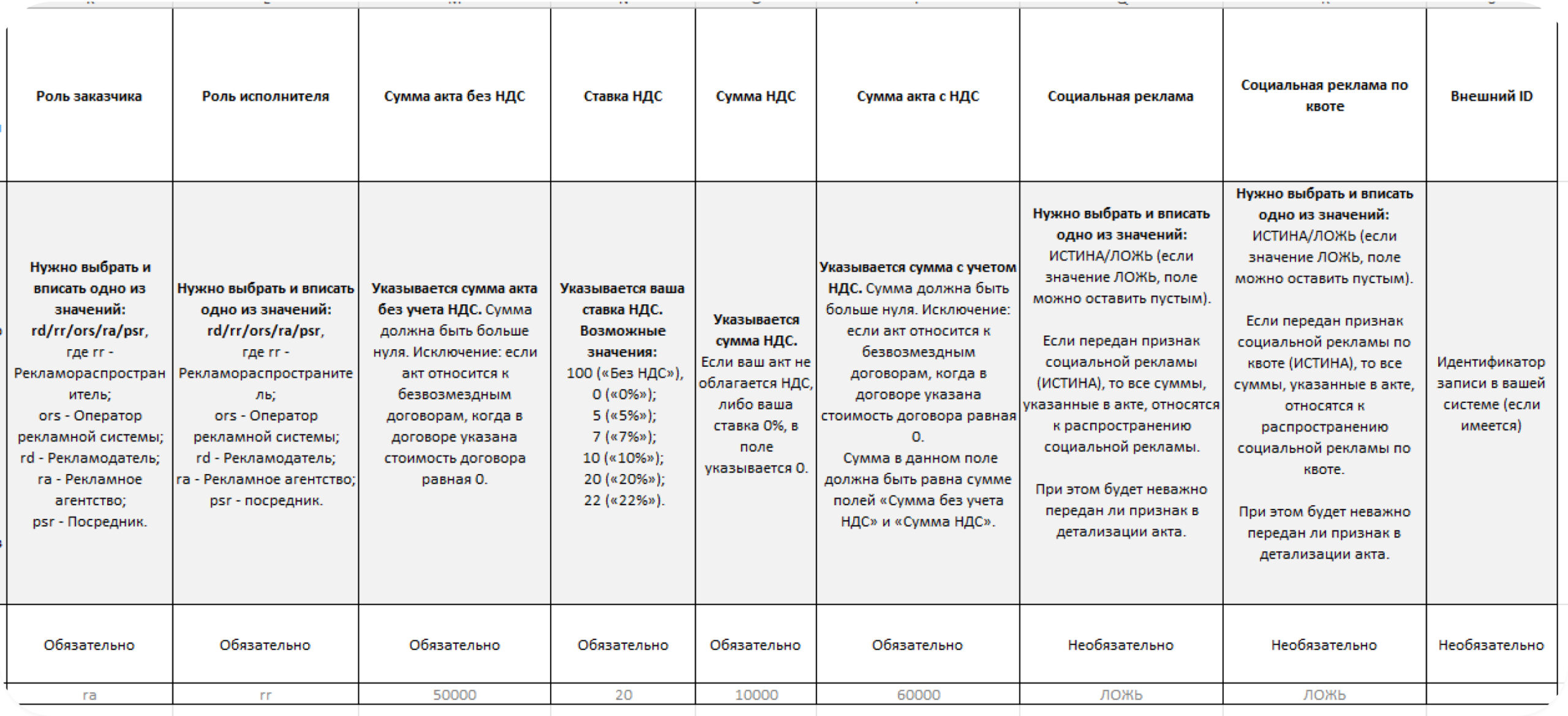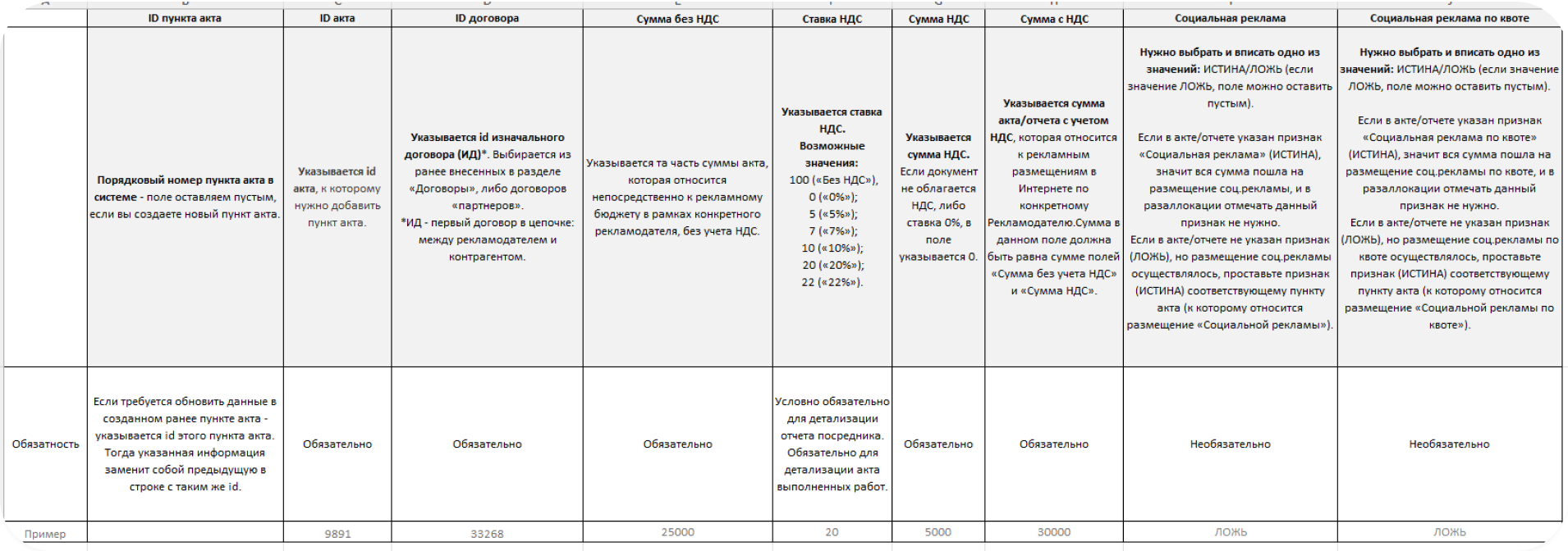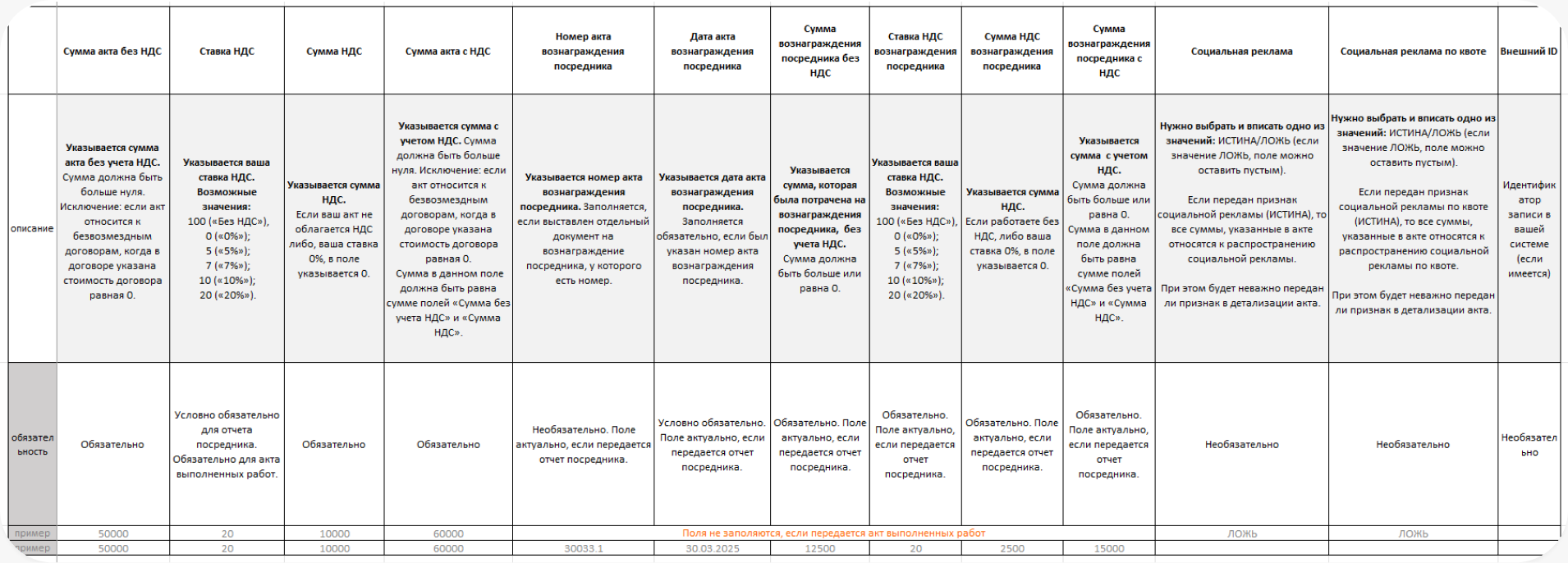 Если при подаче сумм в пункте акта у вас есть дробные (нецелые) значения, необходимо округлять их до двух знаков после точки с учётом допустимой погрешности (правила и пример расчётов – здесь). При этом все равно необходимо соблюдать правило: Сумма рекламного бюджета с НДС должна быть равна сумме полей «Сумма без учета НДС» и «Сумма НДС».