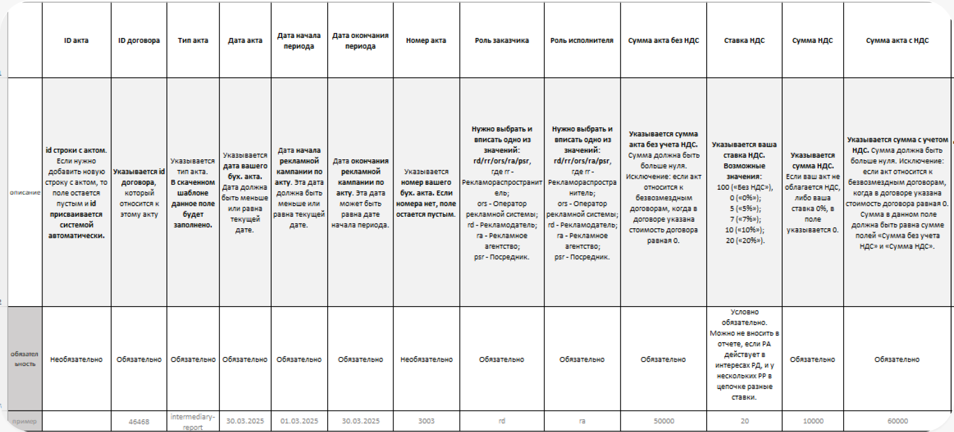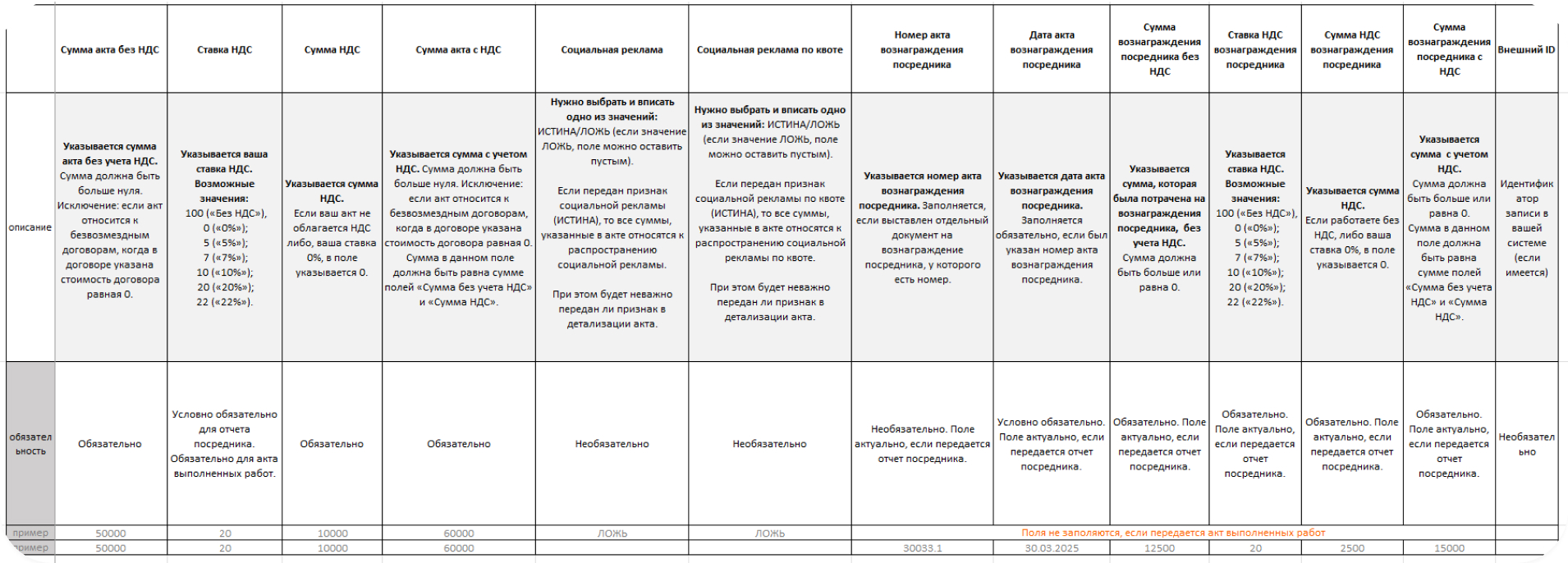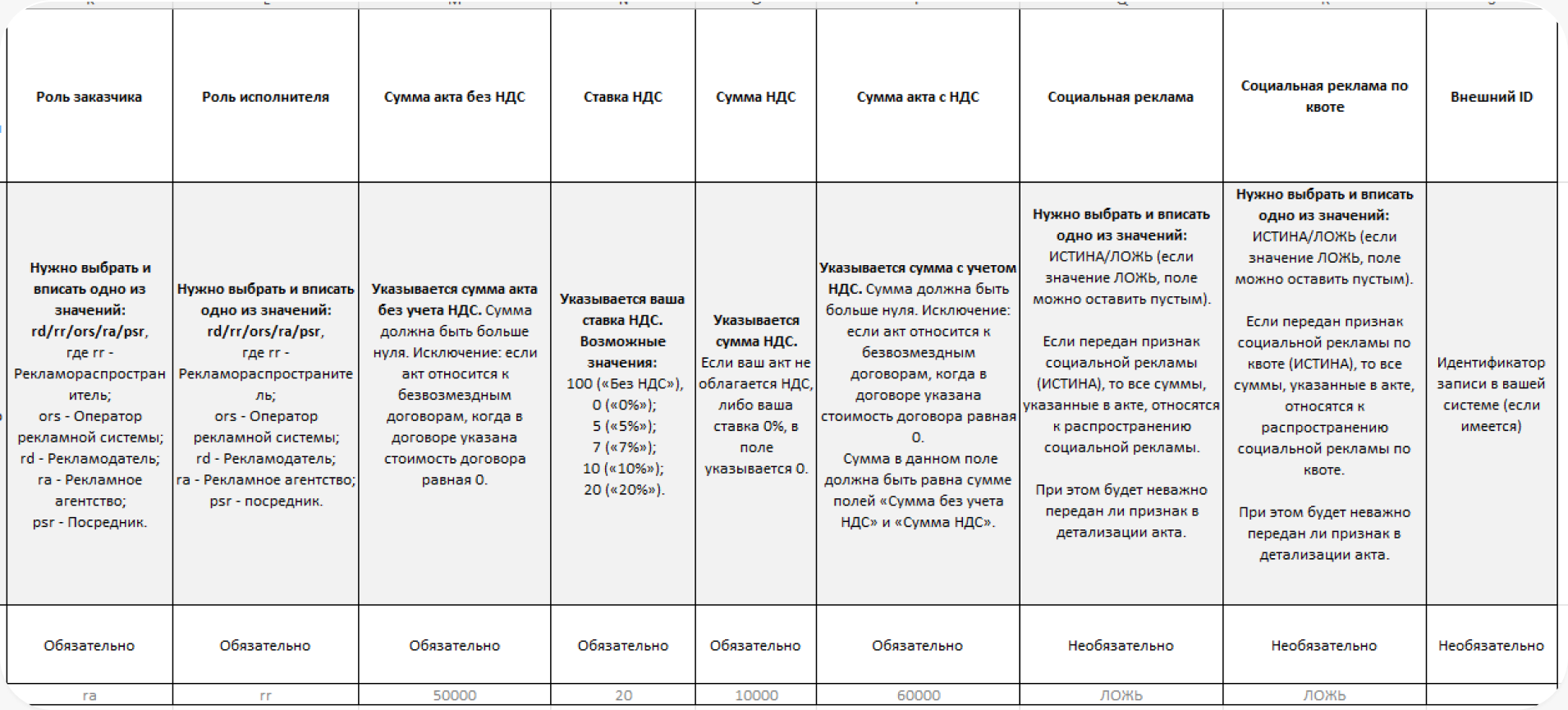Если при подаче сумм в пункте акта у вас есть дробные (нецелые) значения, необходимо округлять их до двух знаков после точки с учётом допустимой погрешности (правила и пример расчётов – здесь). При этом все равно необходимо соблюдать правило: Сумма рекламного бюджета с НДС должна быть равна сумме полей «Сумма без учета НДС» и «Сумма НДС».