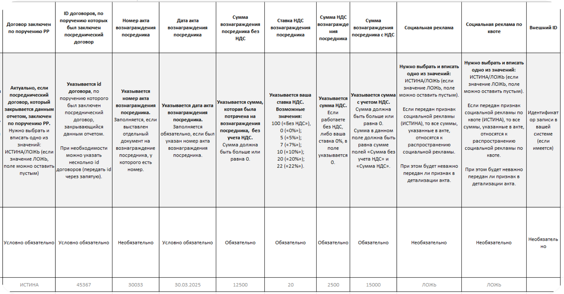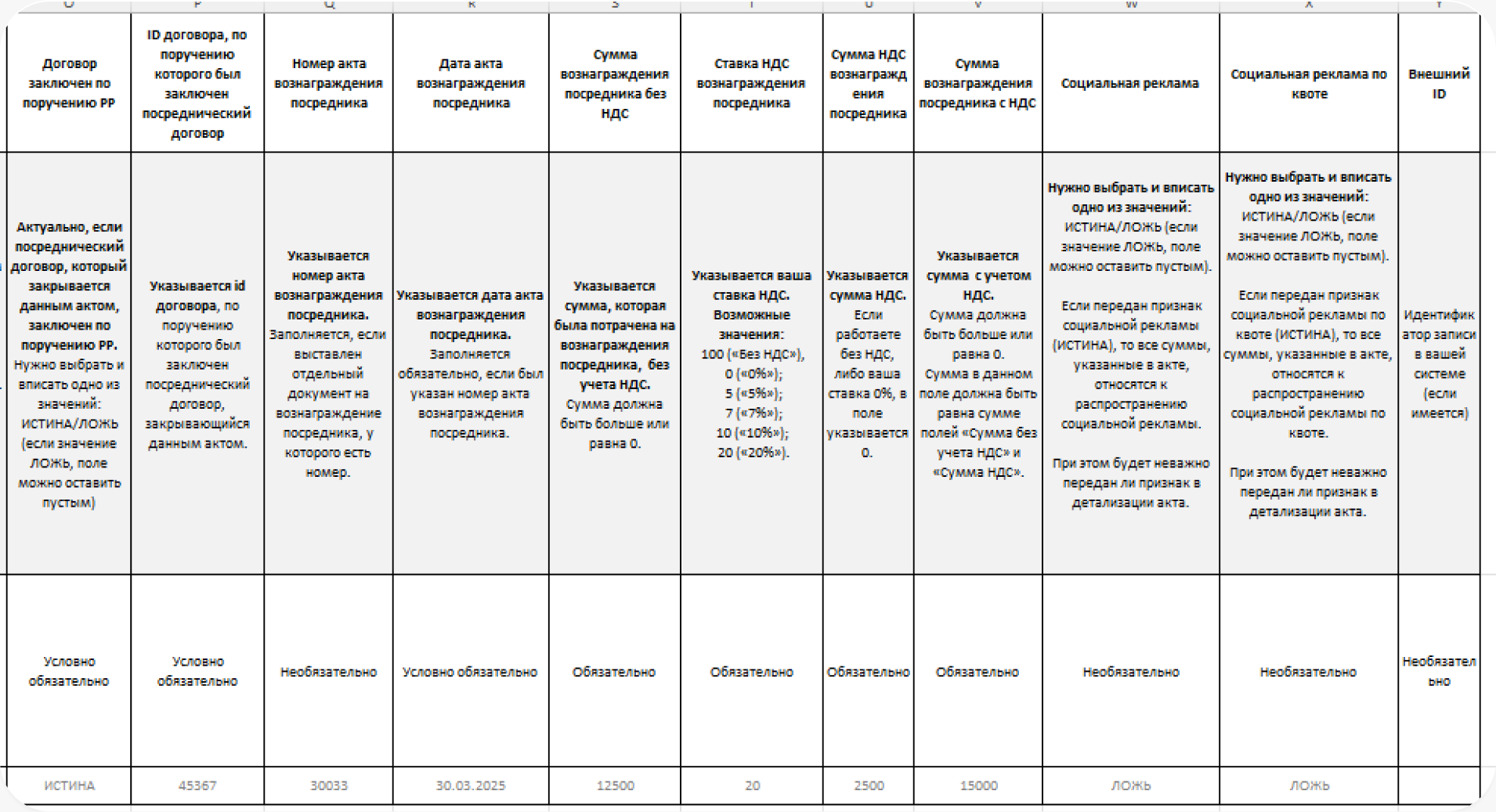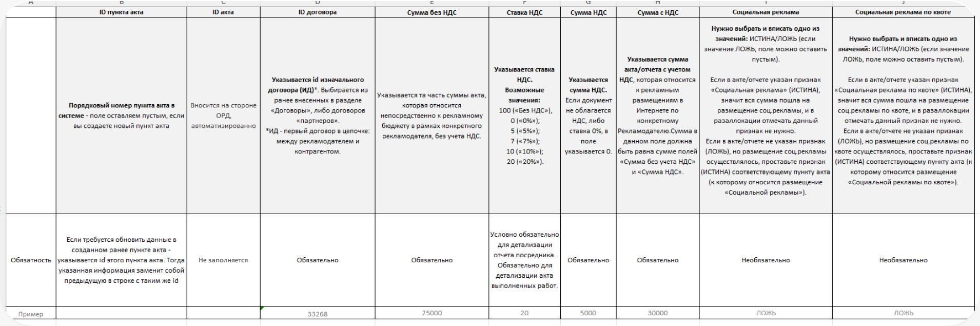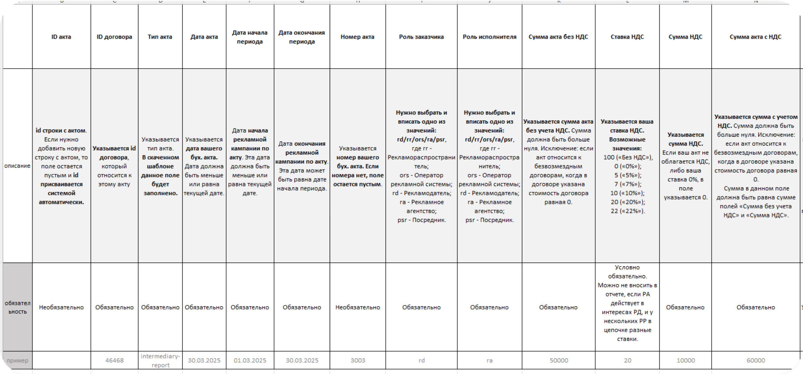 Если при подаче сумм в пункте акта у вас есть дробные (нецелые) значения, необходимо округлять их до двух знаков после точки с учётом допустимой погрешности (правила и пример расчётов – здесь). При этом все равно необходимо соблюдать правило: Сумма рекламного бюджета с НДС должна быть равна сумме полей «Сумма без учета НДС» и «Сумма НДС».