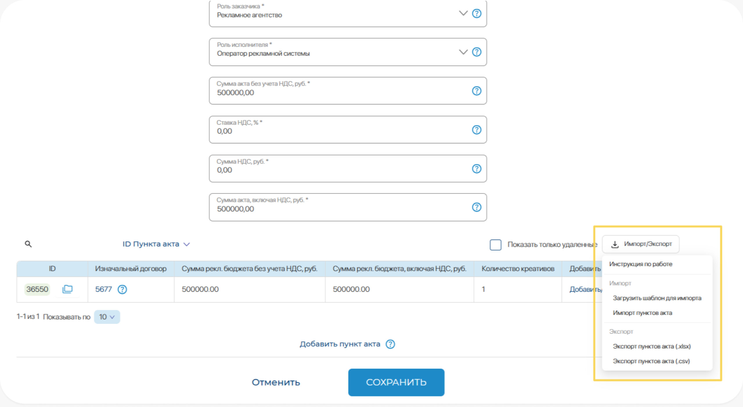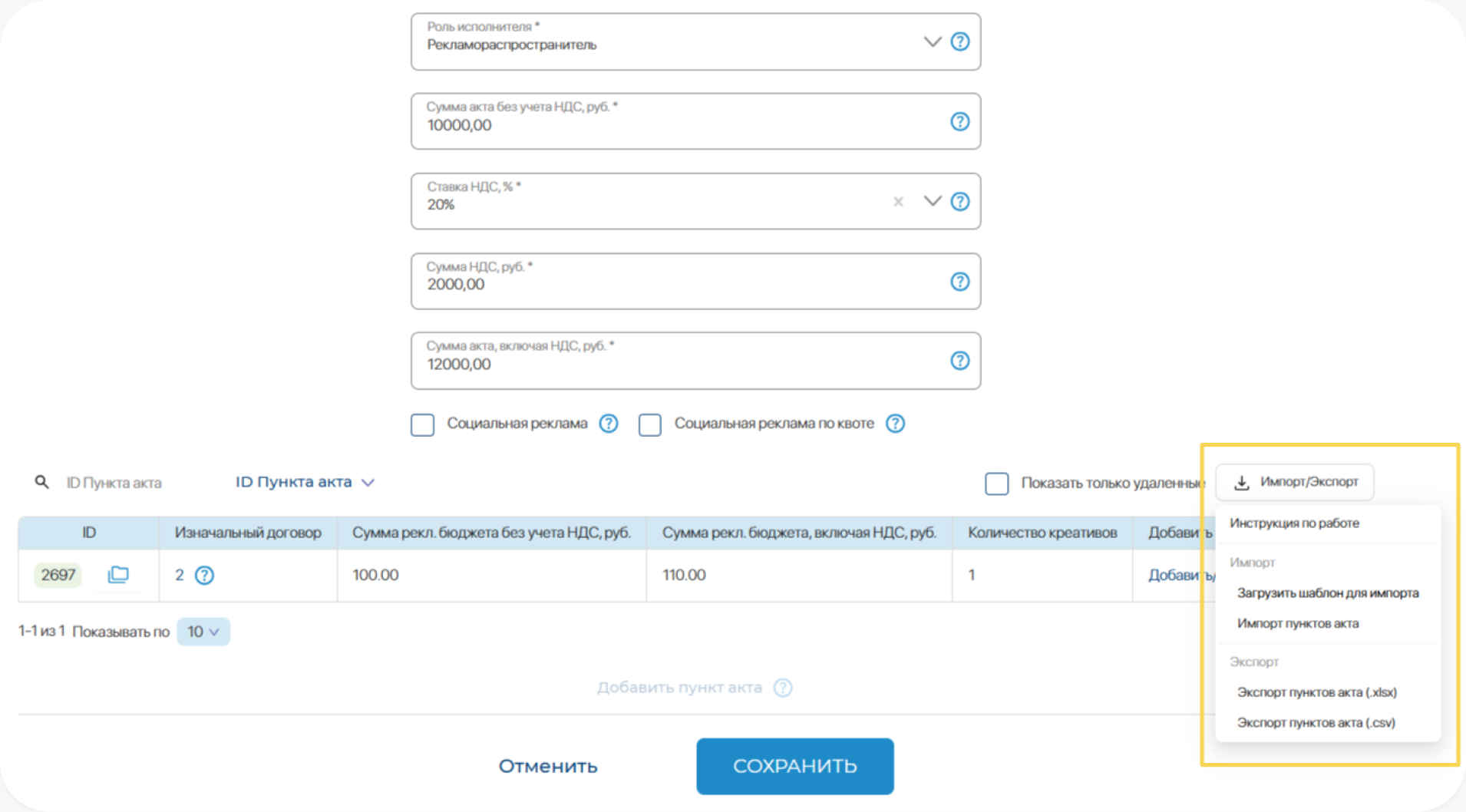 Экспорт/Импорт в разделе с пунктами акта (при разаллокации акта по изначальным договорам): в разделе с добавлением пункта акта есть возможность массово и экспортировать и импортировать данные.