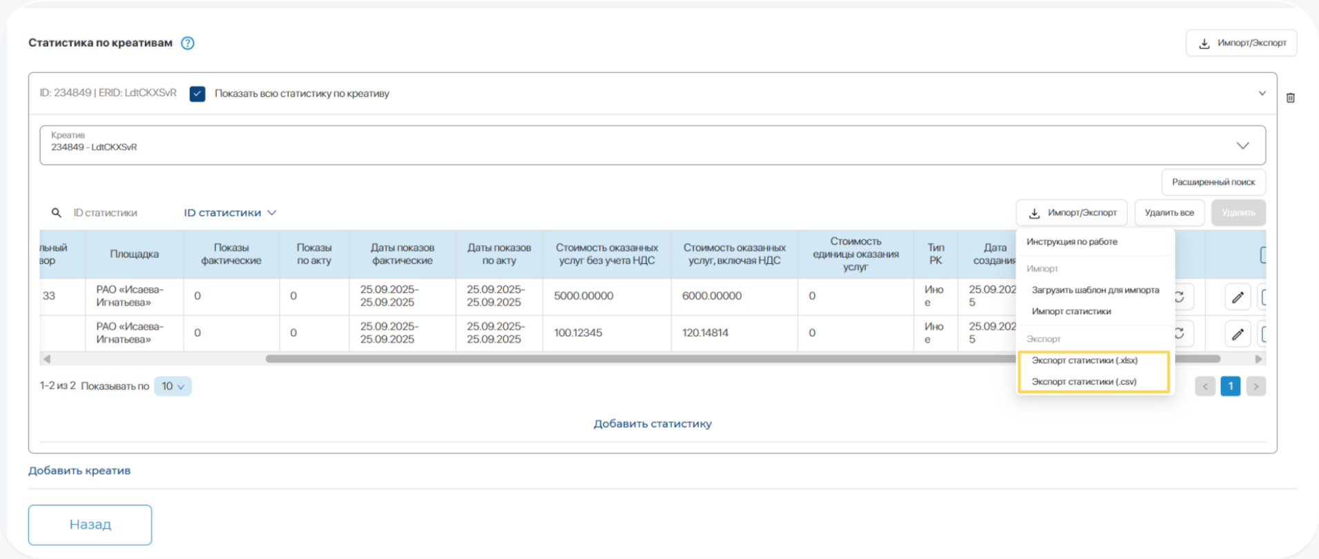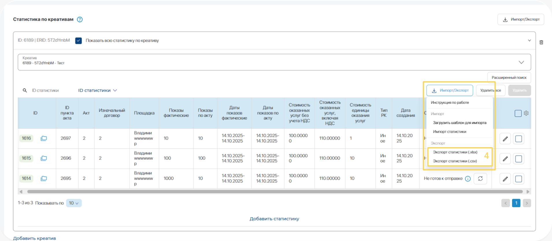 2. экспортировать (выгрузить) все статистики по креативам, которые относятся к этому акту;