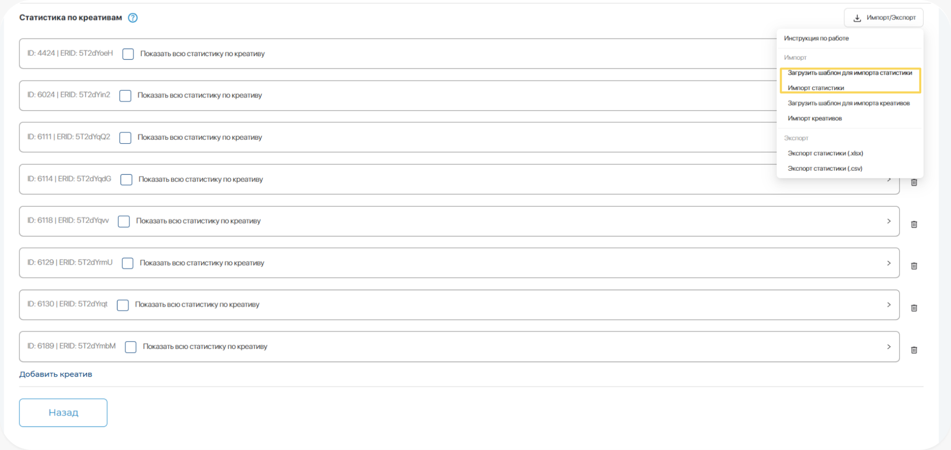 4.2 Импорт статистики по выбранному креативу в разделе разаллокации