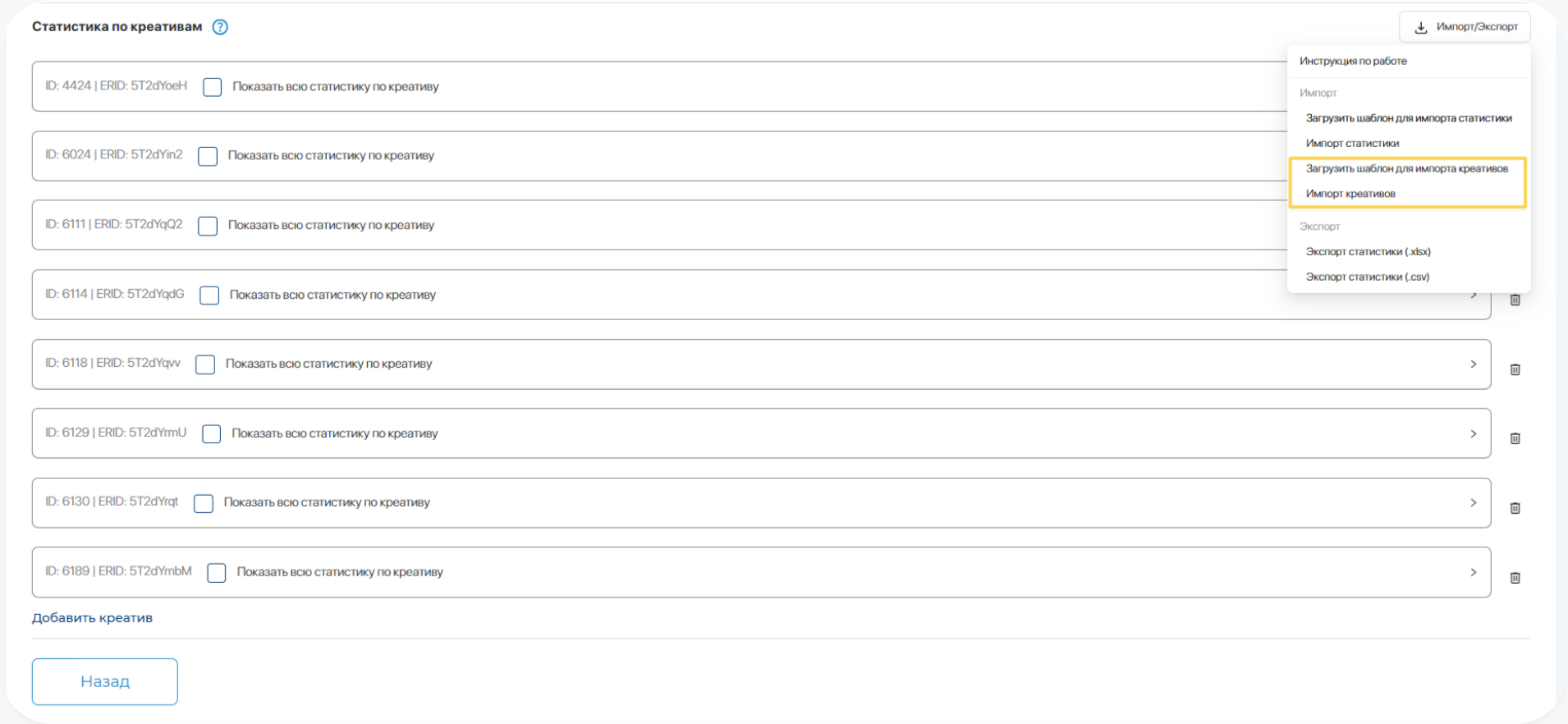 Для массовой загрузки в систему статистик, которые относятся сразу к нескольким креативам, также используется кнопка «Загрузить шаблон для импорта», но в общем разделе с креативами.
