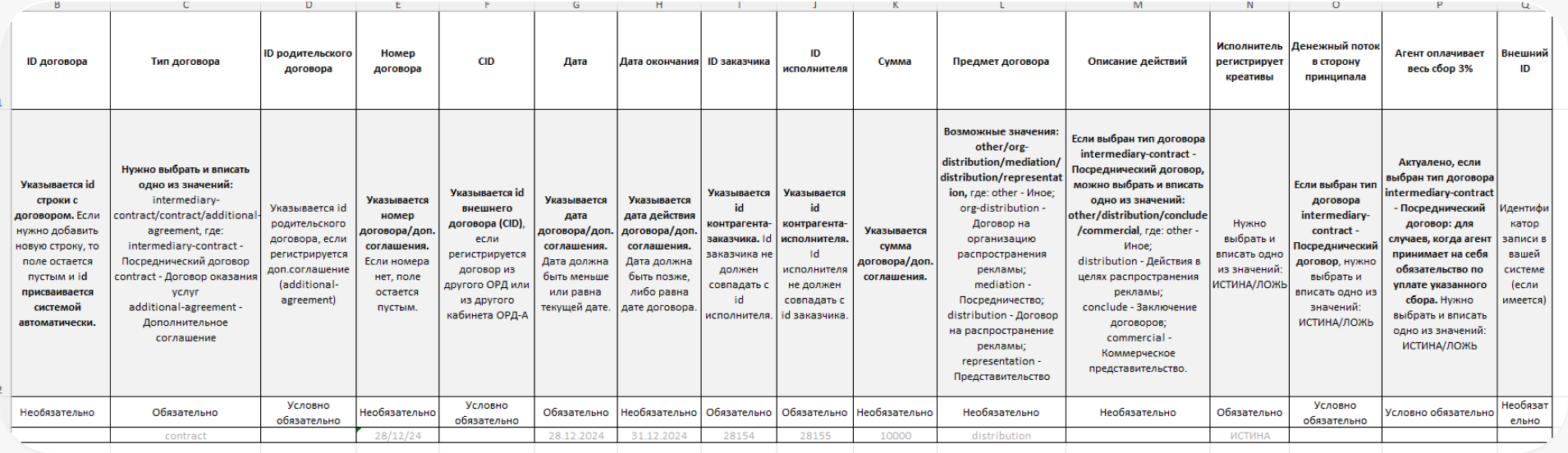 Для массовой загрузки договоров выбираем «Загрузить шаблон для импорта» – на ваше устройство скачается файл «contracts_import». Заполняем этот файл по шаблону:
