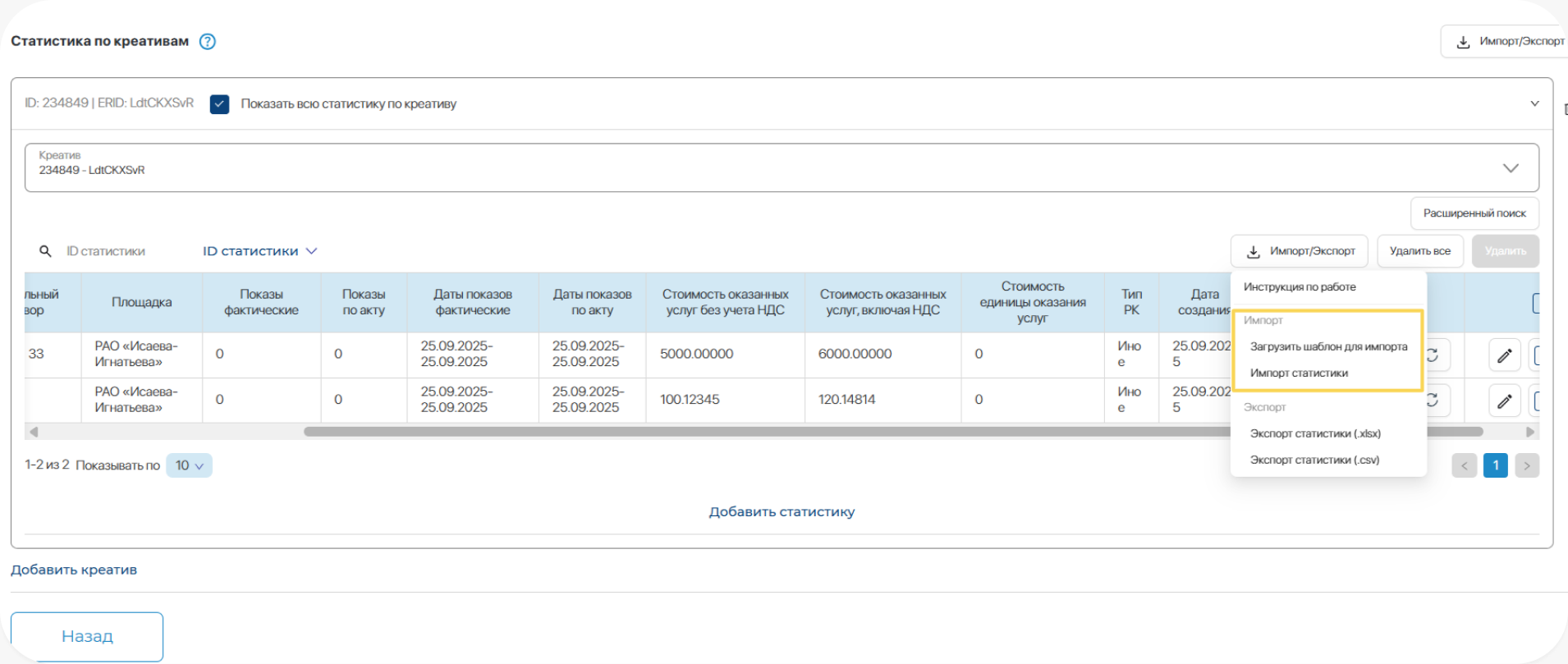 Экспорт/Импорт в разделе со статистикой по креативам (при разаллокации акта по креативам). В разделе разаллокации акта по креативам есть возможность массово: