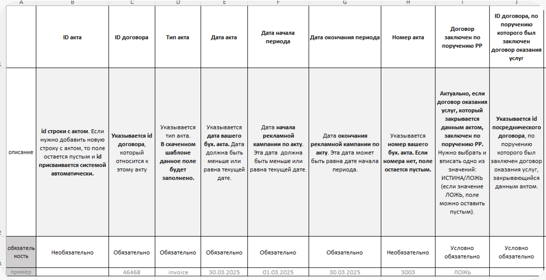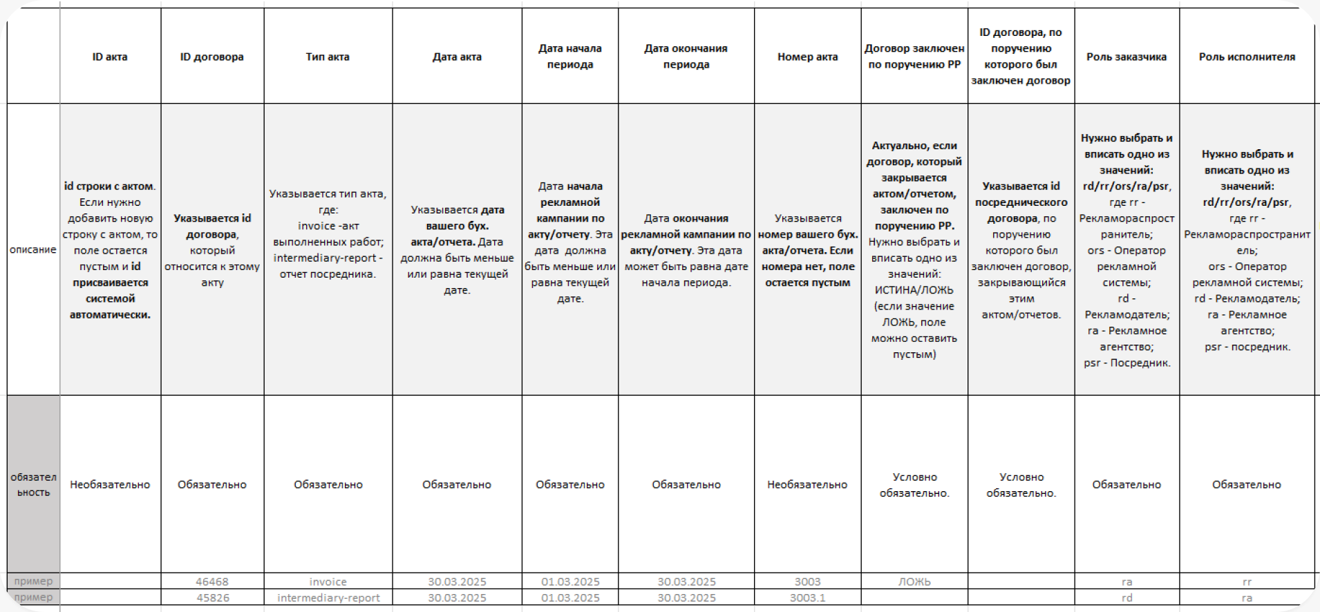 Если необходимо загрузить акты выполненных работ и отчеты посредника (включая вознаграждение посредника) – можно выбрать общий шаблон для импорта. На ваше устройство скачается файл «invoices_import». Заполняем этот файл по шаблону:
