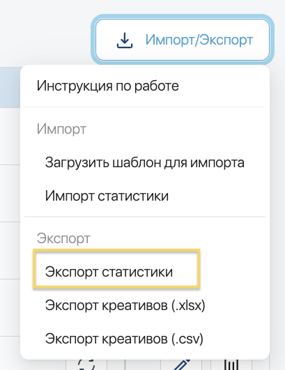 Статистику по каждому конкретному креативу можно массово экспортировать и импортировать, перейдя в нужный креатив в режиме редактирования (нажимаем на карандашик в общей таблице креативов).