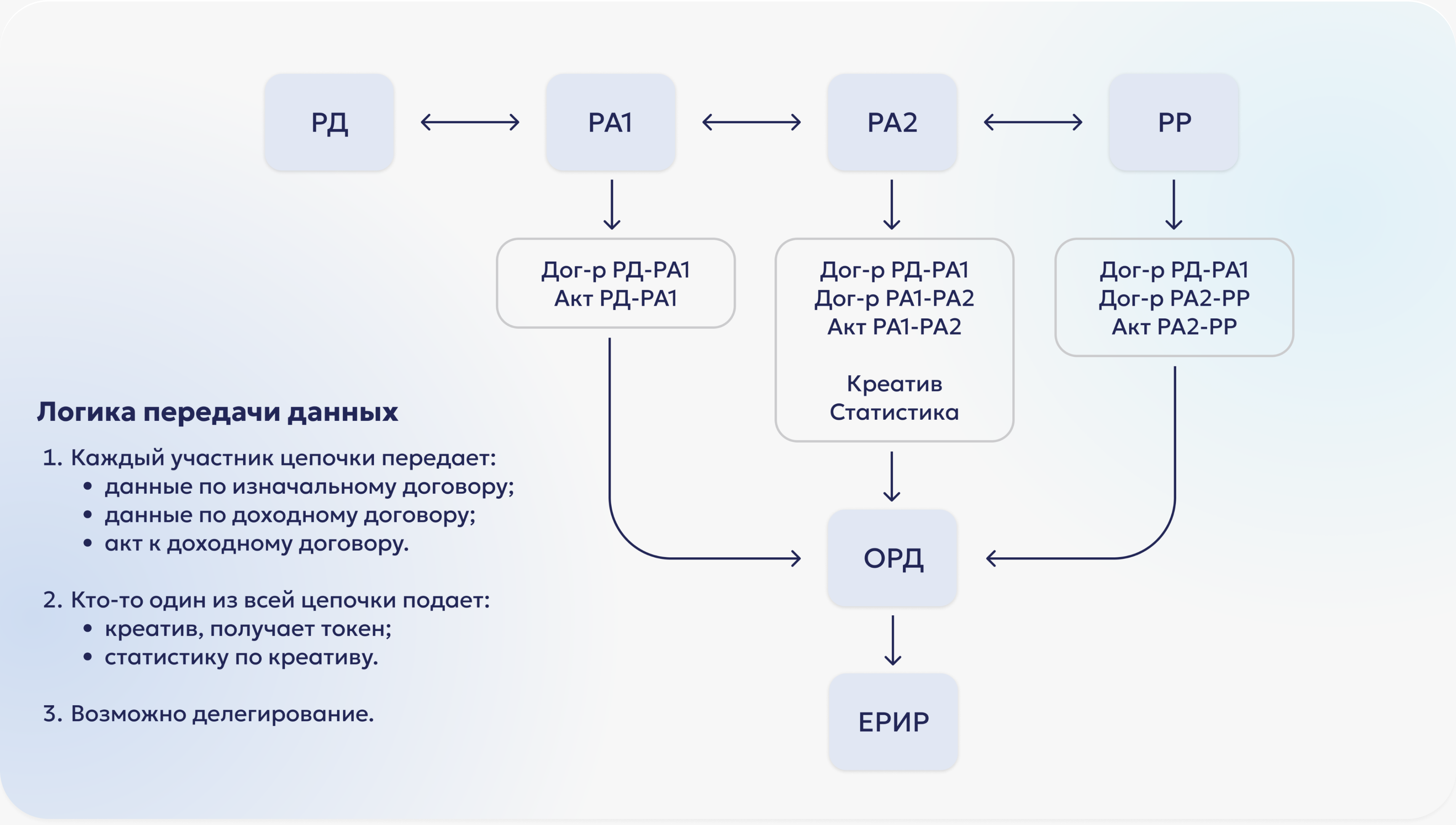 Согласно разъяснениям РКН, можно делегировать обязанность по предоставлению информации третьим лицам в рамках гражданско-правовых отношений. Под делегированием подачи данных Роскомнадзор понимает именно технологическую помощь в подаче данных в ОРД. Мы рекомендуем прописать обязанности каждого участника по передаче данных в договоре.