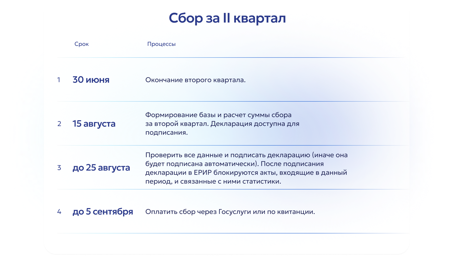 В течение нескольких дней после передачи данных о сделке их можно будет проверить в ЛК ЕРИР. После 15-го числа второго месяца следующего за кварталом формируется декларация, которая подлежит подписанию до 25-го числа. Оплата сбора должна быть произведена не позднее 5-го числа третьего месяца квартала, следующего за платежным периодом – через Госуслуги или по квитанции.