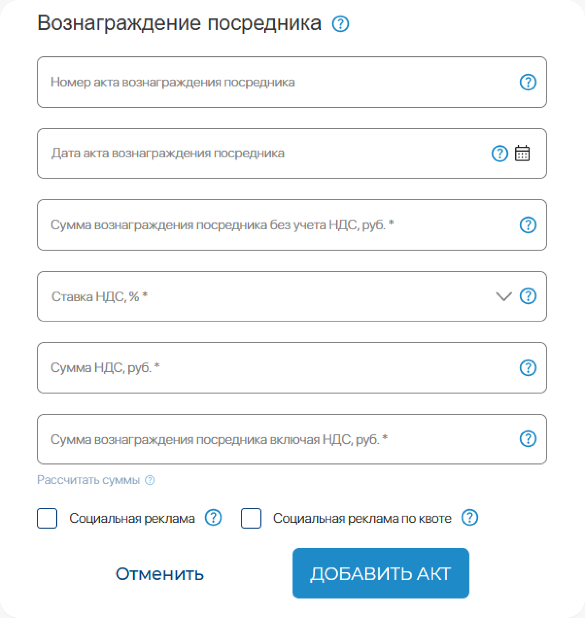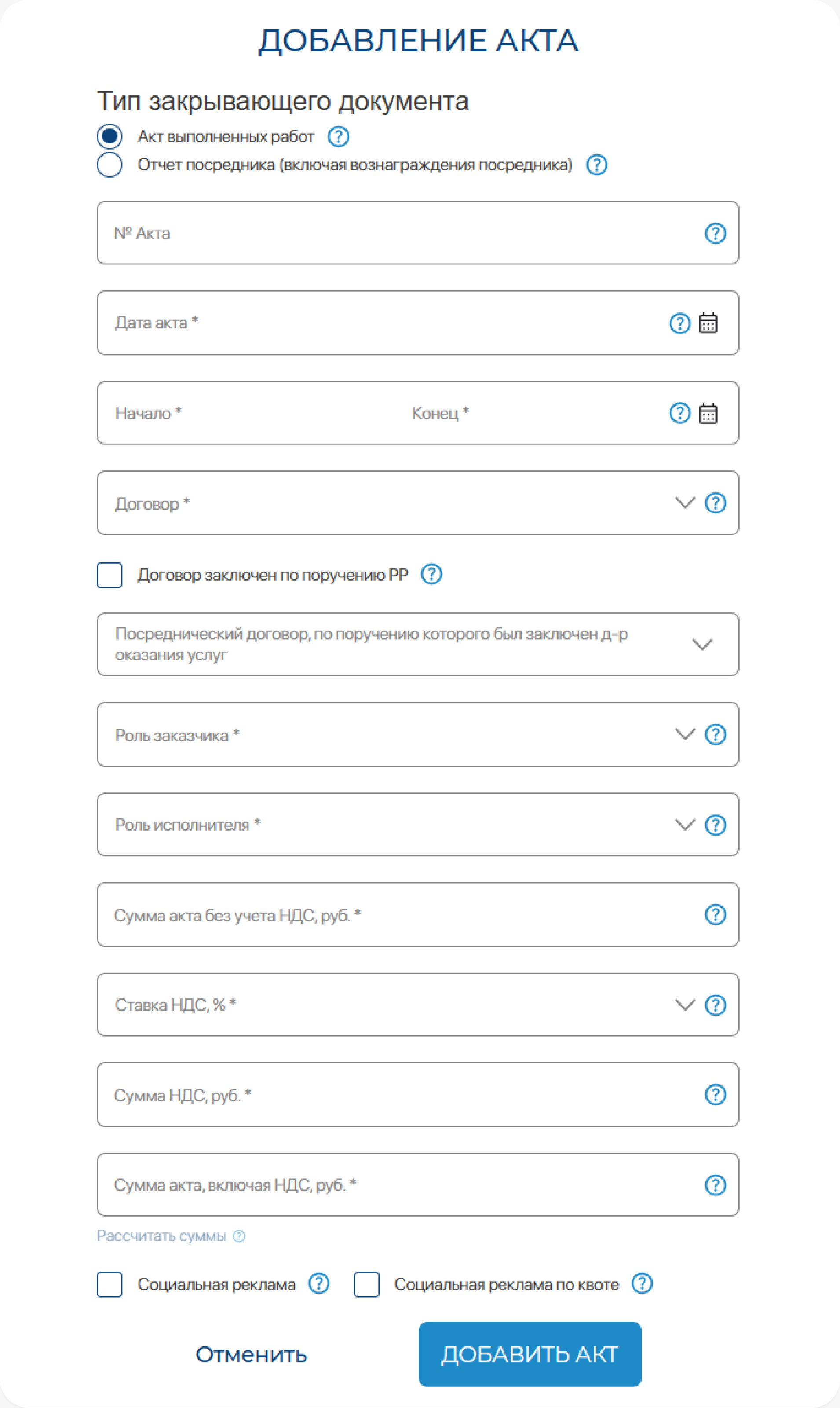 Если же акт включает размещения как по «Социальной рекламе», так и по обычным креативам, чекбокс не указывается на уровне акта — он проставляется при добавлении соответствующего пункта акта.