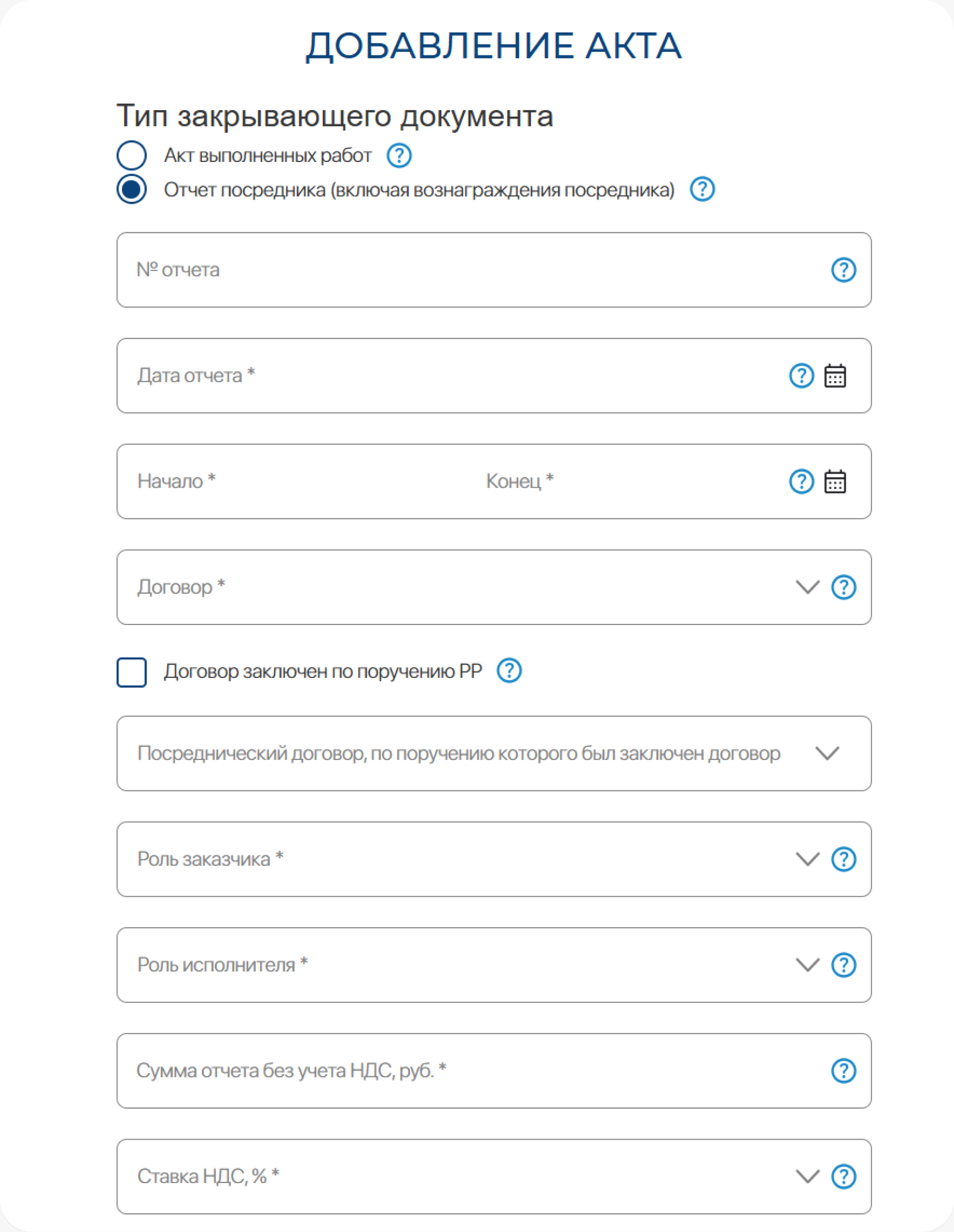 4) Договор, который закрывается этим отчетом (это может быть сам родительский договор, но допустимо указать и доп. соглашение/приложение). Начинаем вводить номер договора, ранее занесенного в систему, далее выбираем его из выпадающего списка. Тип такого договора должен обязательно быть – «Посреднический».